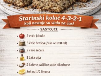 Sastojci: • 4 veće jabuke • 3 čaše brašna (čaša od 200 ml) • 2 čaše šećera • 1 čaša ulja • 2 kafene kašičice […]