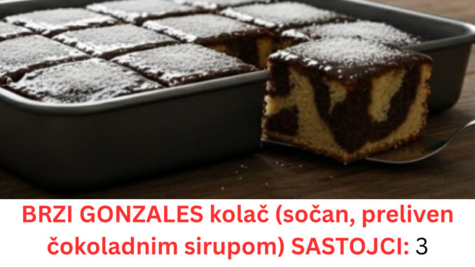Brzi Gonzales je jedan od onih kolača koji se prave „iz rukava“ – bez komplikacija i dugačkog mućenja, a rezultat je mekan, sočan i predivno čokoladan kolač koji se preliva vrućim prelivom. Idealno za kada želite nešto brzo, jednostavno, a efektnog ukusa! Peče se kratko, sastojci su osnovni, i uvek ispadne savršeno. Ovaj recept je originalno delila J. Nermina i postao je pravi hit među ljubiteljima brzih kolača.