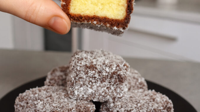 8. Svaku kocku kratko umočite u toplu čokoladnu glazuru, zatim uvaljajte u kokos.
