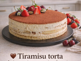 📝 Sastojci (kalup 24–26 cm) Biskvit / podloga: • 400 g piškota (savoiardi) Za natapanje: • 300 ml jake crne kafe (ohlađene) • 100 ml […]