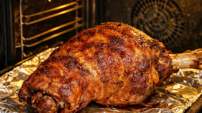 4. Skinite foliju, pojačajte na 200 °C i pecite još 30–40 minuta, povremeno prelijevajući sokom iz pleha, dok ne dobije lijepu zlatno-smeđu koricu.