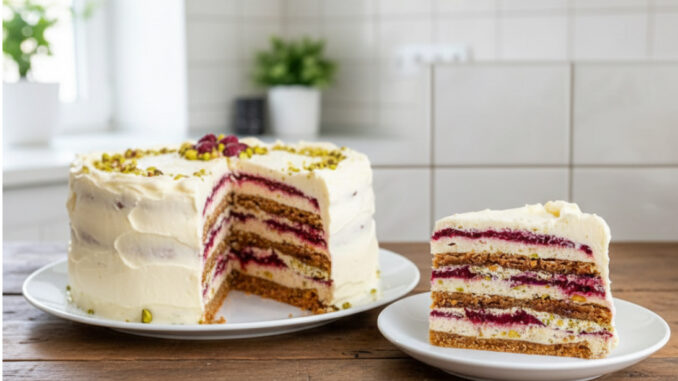 Dobiješ mekanu, laganu, bogatu posnu tortu s finim ukusom pistaća – savršenu za slave, rođendane i svečane prilike.