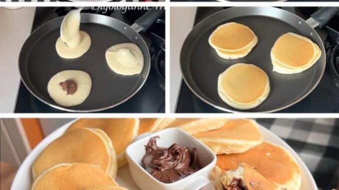 U malom tiganju zagrejte malo ulja i u njega ulijte malu kašiku smese za palačinke. Na vrh stavite kašiku kreme od čokoladnih lešnika i nekoliko kriški banane, a zatim prelijte kašikom mešavine za palačinke.