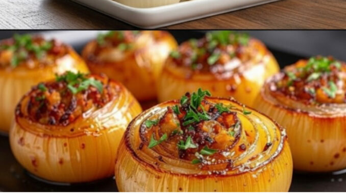 9. Serviranje: Nakon pečenja, premaži vrhove luka ostatkom putera radi sjaja i dodatnog ukusa. Posluži toplo — odlično ide uz svježu salatu ili domaći hljeb.